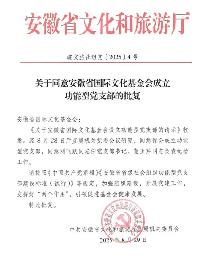 为深入学习贯彻党的二十大精神,进一步加强党员队伍建设和组织建设,充分发挥党建引领和党员先锋模范作用。2025年8月,根据中共安徽省文化和旅游厅直属机关委员会批复,安徽省国际文化基金会功能型党支部正式成立,标志着基金会的发展迈入了“党建引领、规范前行”的新阶段,在推动公益事业与党建工作深度融合方面迈出了坚实的一步。安徽省国际文化基金会功能性党支部的正式成立,也标志着基金会党建工作开启了新篇章,为公益事业发展注入强大的精神动力。站在新的历史起点上,我们将深入学习贯彻习近平总书记关于公益慈善事业的重要指示批示精神,坚持党建引领,积极承担行业、社会所赋予的责任,以党支部为纽带,不断提高政治理论素质,凝聚党员力量,携手社会各界爱心人士,发挥独特优势,共同推动公益慈善事业的发展。