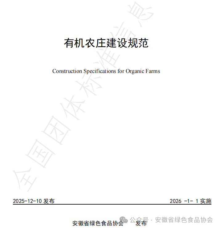 12月10日,安徽省绿色食品协会在全国团体标准信息平台正式发布了《绿色食品 玉米种植技术规范》、《绿色食品 辣椒种植技术规范》、《绿色食品 西瓜种植技术规范》、《绿色食品 鲜食露地桃种植技术规范》、《绿色食品 梨种植技术规范》、《绿色食品 瓜蒌(籽)种植技术规范》、《有机农庄建设规范》、《有机产品大水面养殖技术规范 鲢鳙鱼》、《绿色有机餐厅建设规范》9项团体标准,这些标准将自2026年1月1日起实施。